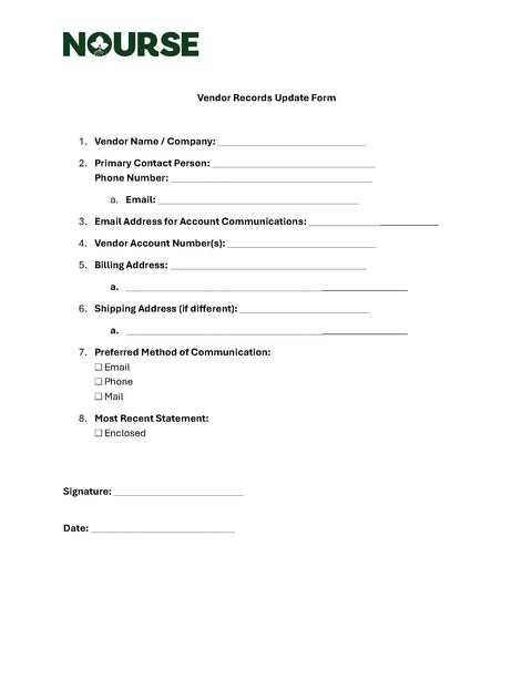 Please complete the vendor information form and and return it with a copy of your most recent account statement to accounting@noursefarms.com by 10/31/2025.